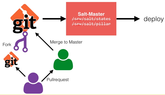 Jeder Mitarbeiter sollte über seinen eigenen lokalen Salt-Master verfügen, der an seinem persönlichen Fork "hängt". Nachdem neue States oder Pillars auf einem Fork getestet wurden, stellt der Mitarbeiter einen Pull-Request, damit die Änderungen in das produktive Master-Repository übernommen werden.